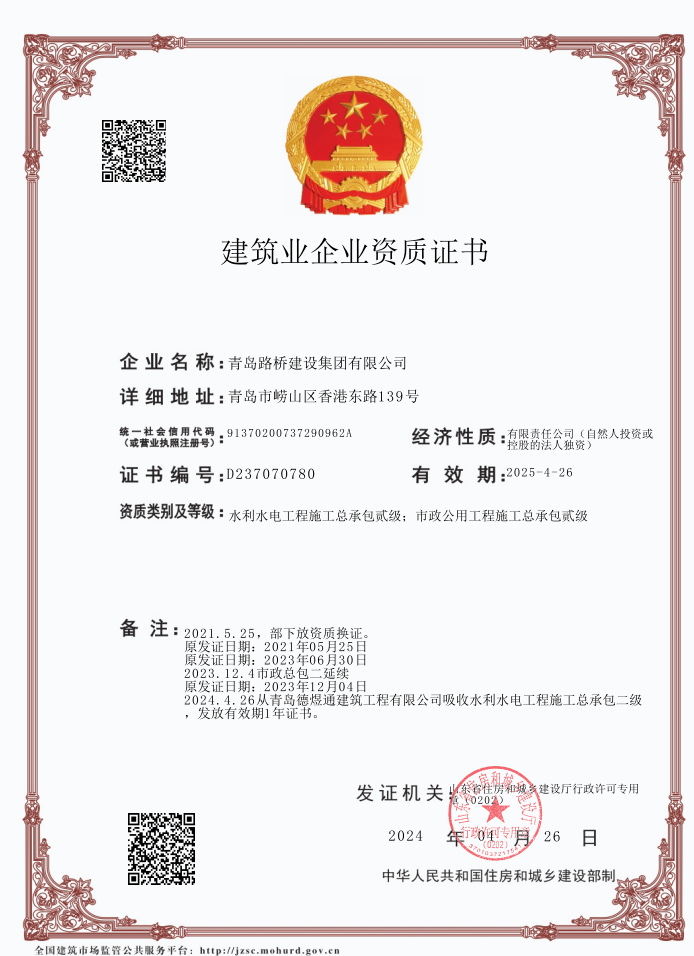 近日,青岛市行政审批局发布了《乐动在线注册核准建设工程相关企业资质和建筑施工企业安全生产许可证名单的通知》,乐动(中国)旗下交发集团取得水利水电施工总承包二级资质,进一步拓宽了集团水利水电工程业务承接范围,为多元化、可持续发展奠定了坚实基础。