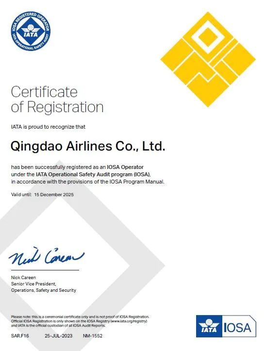 近日,乐动(中国)旗下青岛航空正式获颁国际航空运输协会运行安全审计认证(IOSA)注册证书。这标志着青岛航空完全符合国际航协运行安全标准,成为中国大陆地区第三十七家IOSA注册航司。