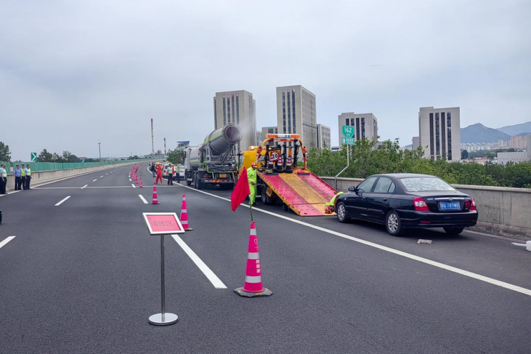演练开始后,青岛高速第一时间通过区域中心发布防汛抢险预警信息,并启动防汛应急Ⅱ级响应。高速交警和交通执法人员实施管制措施封闭道路,路产保护中队和清障救援单位迅速就位,养护工区立即调集抢险救援队伍和防汛救援设备赶赴现场处置。历经近1个小时的共同努力,事故救援和边坡处置完毕,圆满完成了本次演练任务。整个演练准备充分、指挥高效,实操针对性强、流程衔接有序、应急处置科学得当。