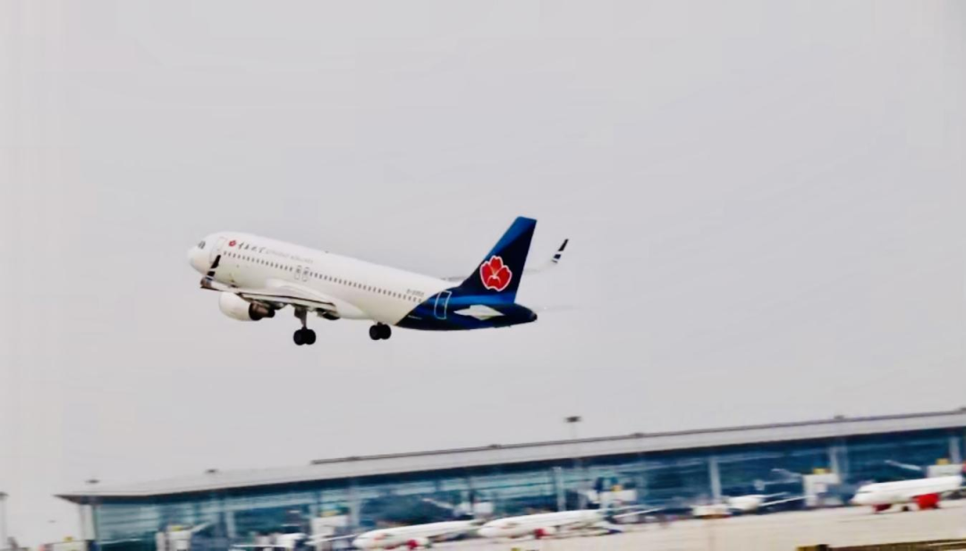 (图为青岛航空航班在青岛胶东国际机场起飞)