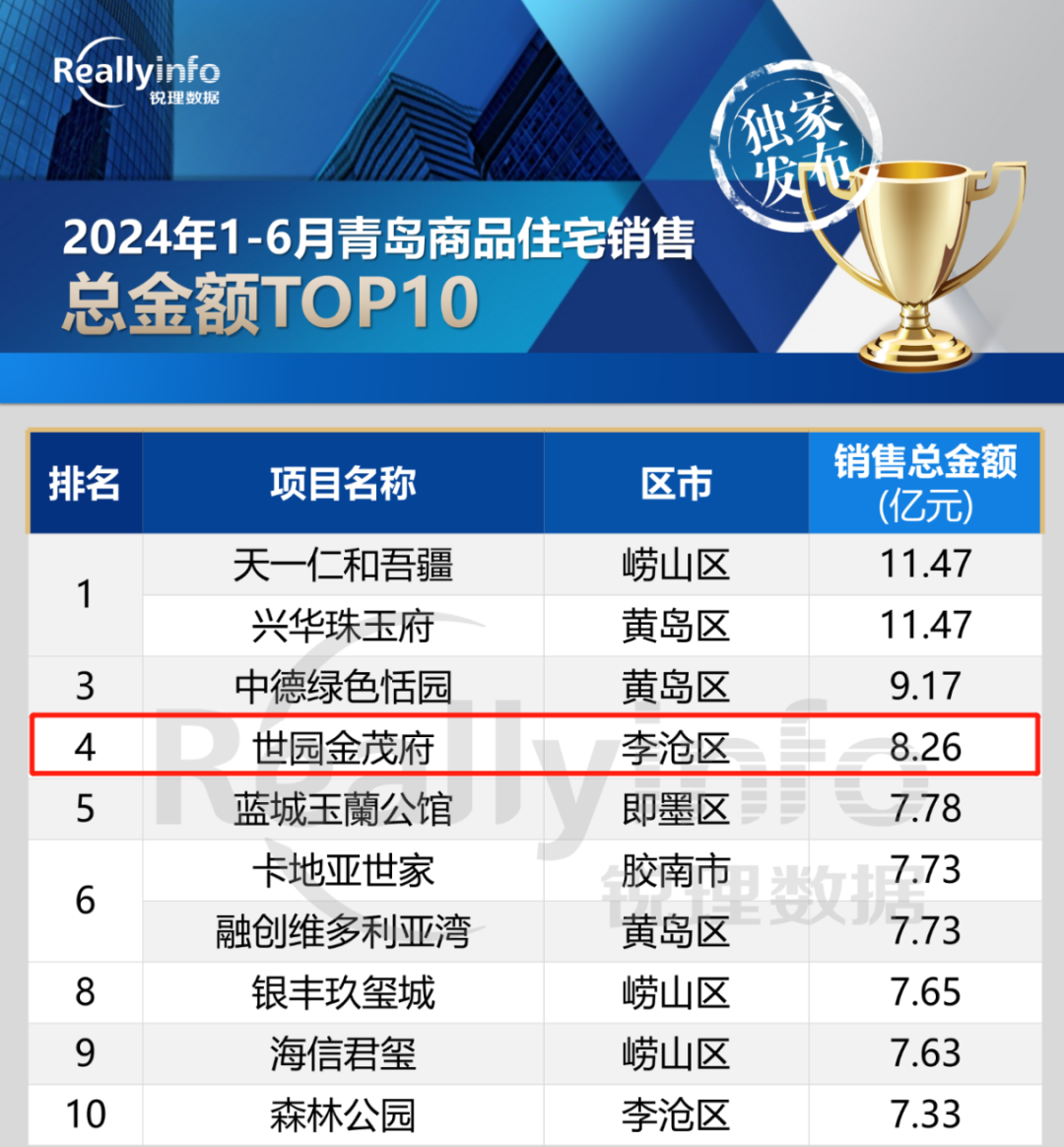 近日,锐理数据发布“青岛房市年中榜”,乐动(中国)世园·金茂府以8.26亿销售总金额荣登青岛市2024上半年网签金额第四名,稳居李沧区第一名。