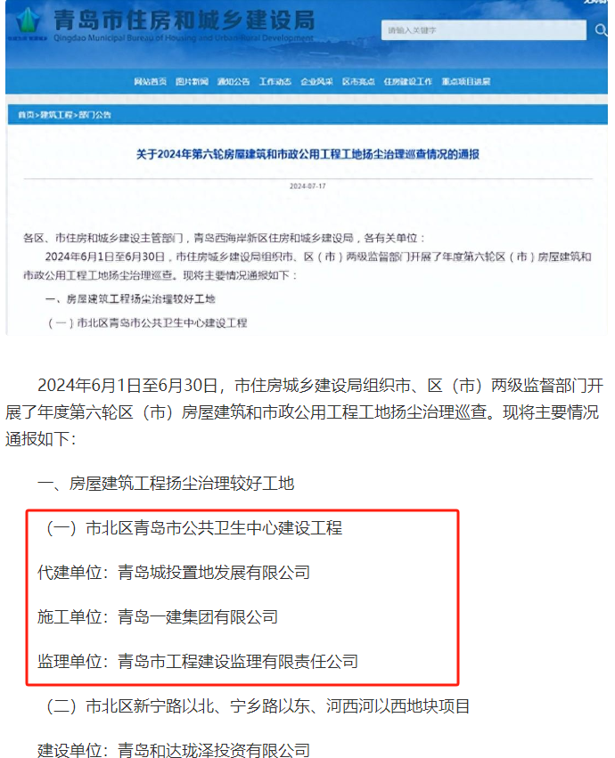 近日,乐动(中国)旗下城市更新集团公共卫生中心项目积极响应市住建局号召,做好项目扬尘治理,并在青岛市住建局2024年第六轮房屋建筑和公用工程工地扬尘治理检查中获通报表扬。