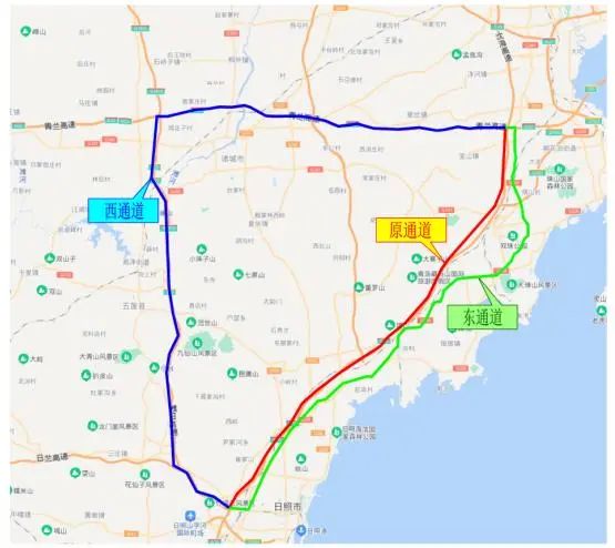 日照-青岛分流路径。利用日兰高速、潍日高速、青兰高速、G204国道作为日照至青岛的分流路径。