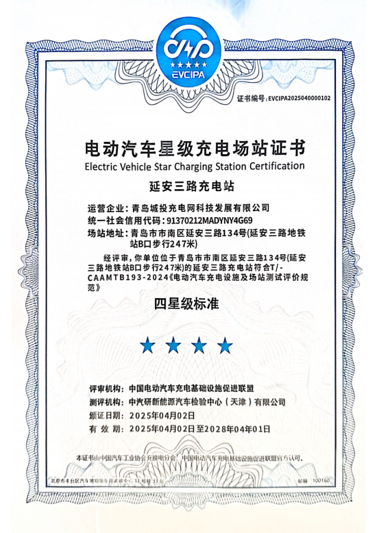 星级体验!青岛城投充电网荣获中国充电联盟星级充电场站