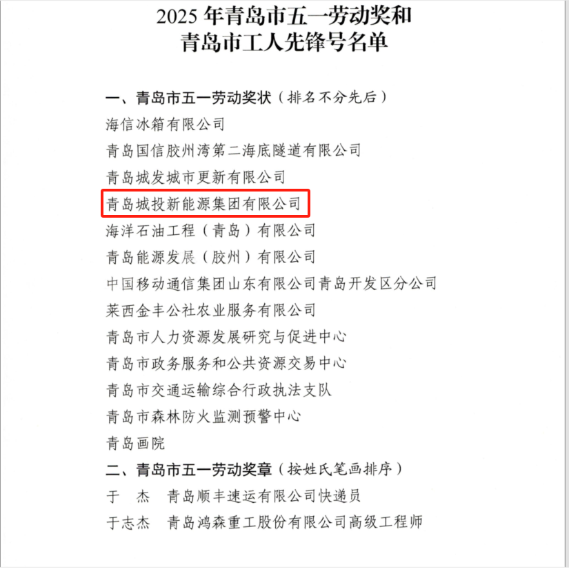 青岛城投新能源集团荣获“青岛市五一劳动奖状”