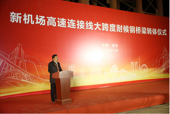 11月3日晚,新机场高速连接线(双埠-夏庄段)工程大跨度耐候钢桥梁转体仪式隆重举行,市政府副秘书长王振东,市住建局副局长胡乐常,城阳区政府副区长李明钢,城投集团党委委员、副总经理于志军,党委委员、纪委书记林本伟,党委委员生锡顺,总工程师么子寅出席仪式。