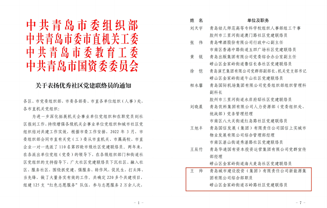 近日,市委组织部、市直机关工委、市委教育工委、市国资委四部门联合行文《乐动在线注册表扬优秀社区党建联络员的通知》对青岛城投新能源集团王帅同志等55名优秀社区党建联络员进行了表彰。2022年以来,城投集团与金家岭街道石岭路社区开展党建结对共建“双报到”,本次表彰再次体现了有关部门对集团党建共建工作的高度评价。