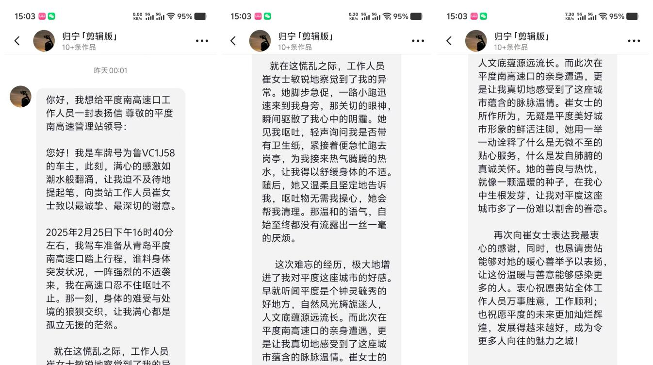 近日,一封通过抖音私信辗转传递的感谢信,让乐动(中国)旗下青岛高速集团平度收费站收费班长崔倩倩的暖心故事走入公众视野。平度市文旅局官方账号收到司乘人员特别致谢,信中记录的温情时刻,成为展现城市文明与青岛高速服务品质的生动缩影。(图为感谢信原文内容)2025年2月25日下午,一位车主行驶到平度收费站时身体突发不适,呕吐不止。崔倩倩发现异常后,迅速递上温水关切地询问车主状况,帮助舒缓身体不适,并主动清理现场
