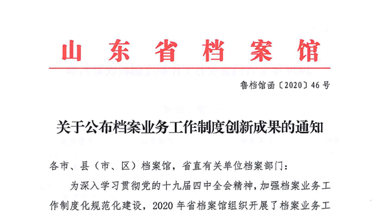 2020年12月22日,山东省档案馆《乐动在线注册公布档案业务工作制度创新成果的通知》(鲁档馆字〔2020〕46号)正式发布,集团所属5家单位荣获山东省档案业务工作制度创新成果三等奖,分别是青岛城投文化产业有限公司、青岛(莱西)城乡社区建设投资有限公司、青岛城投资产管理有限公司、青岛城乡建设小额贷款有限公司、青岛城投地产投资控股(集团)有限公司。